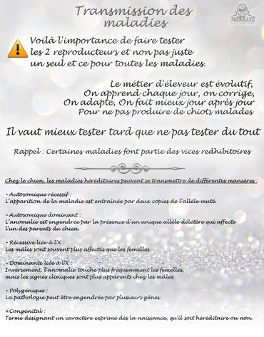 La aussi, malgré toutes les précautions prises, parce que nous travaillons avec des êtres vivants et que la nature n’a pas révélé tous ses mystères, il arrive que parfois les chiots développent certaines maladies non testable chez les parents telle que des dysplasies environnementales, des allergies diverses, des dermatites atopiques etc dont le caractère héréditaire n’a a ce jour pas été démontré.