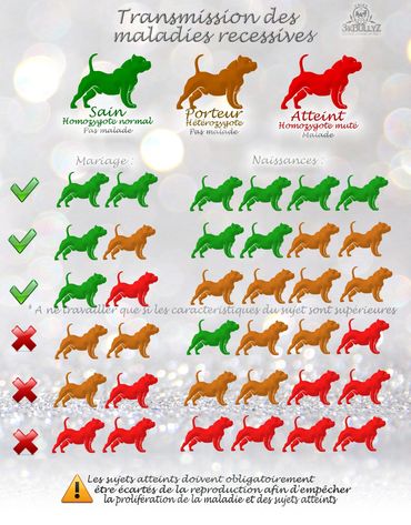 Ce sont des maladies à caractère récessif (sauf pour la CMD, les chercheurs scientifiques se penchent sur de nouvelles études pour la CMD car celle ci est une maladie très complexe), il faut donc que la maladie soit présente sur les deux allèles du gêne pour s’exprimer et rendre le chien atteint de la maladie.